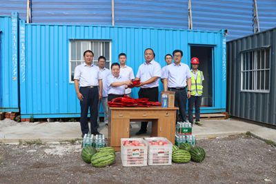 上午8点,公司满载茶叶、西瓜、苹果、花露水等慰问品的商务车缓缓开进职工生活区,李怀生一边给职工发放慰问品一边关心地询问他们的生活和工作情况,并叮嘱他们有困难和问题及时向项目部反映,还要求项目部一定要做好职工的后勤保障,让大家消除后顾之忧。